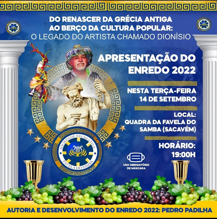 A Favela do Samba retoma nesta terça-feira (14), a partir das 19:00h, suas atividades presenciais na sede de sua quadra social, no bairro do Sacavém, com a apresentação do Enredo para o Carnaval 2022: Do Renascer da Grécia Antiga ao Berço da Cultura Popular : O Legado de um Artista Chamado Dionísio.