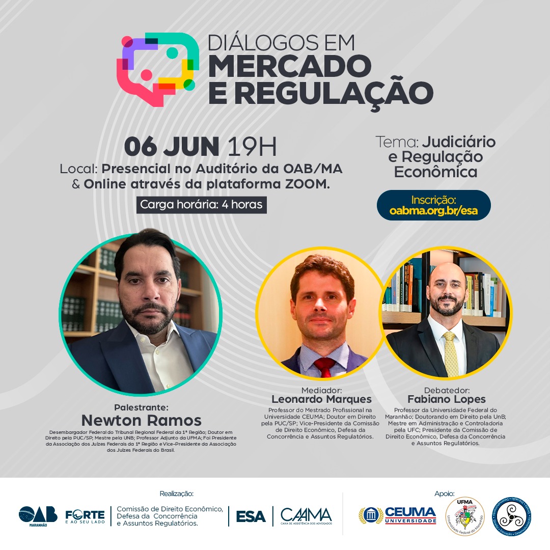 A Ordem dos Advogados do Brasil – Seccional Maranhão — por meio da Escola Superior da Advocacia e da Comissão de Direito Econômico, Defesa da Concorrência e Assuntos Regulatórios, e Grupo de Estudos sobre Direito, Inovação e Desenvolvimento da Universidade Federal do Maranhão — promovem para a advocacia maranhense o projeto Diálogos em Mercado e Regulação no próximo dia 06 de junho, a partir das 19h, no auditório da Seccional.
