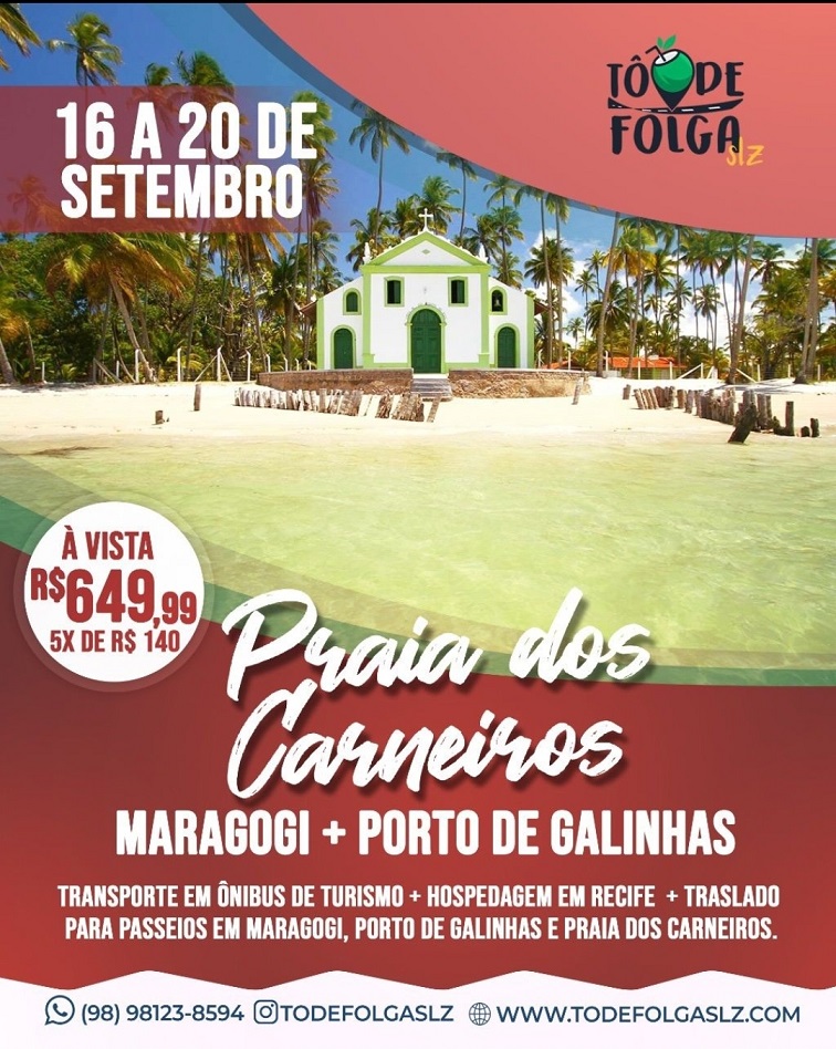 De 16 à 20 de setembro Incluso no Pacote: Transporte em ônibus de Turismo; Hospedagem em Recife com café da manhã (02 diárias); Translado para